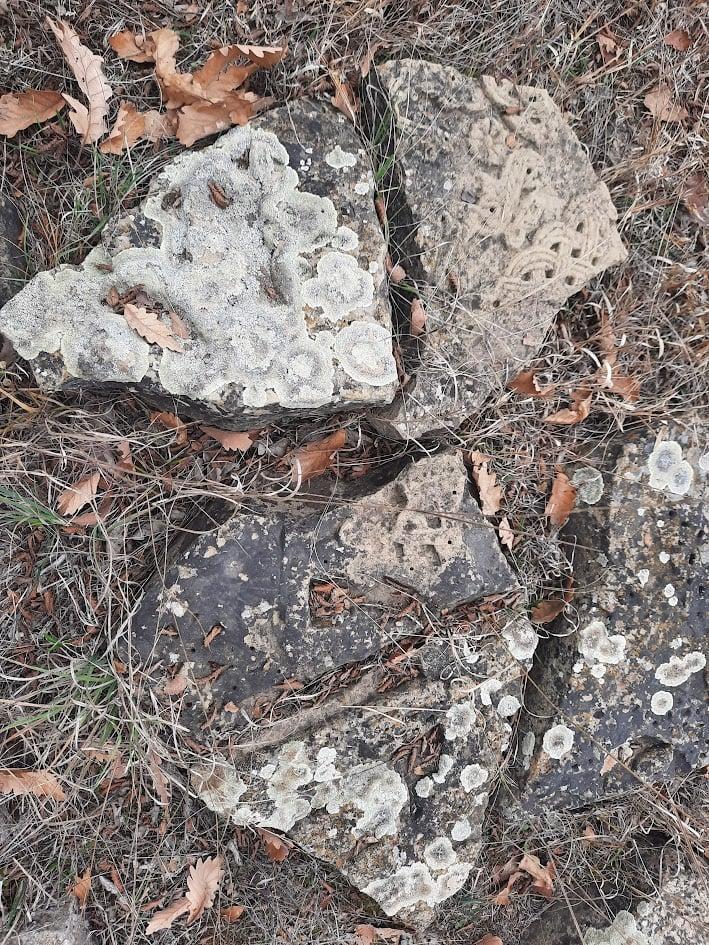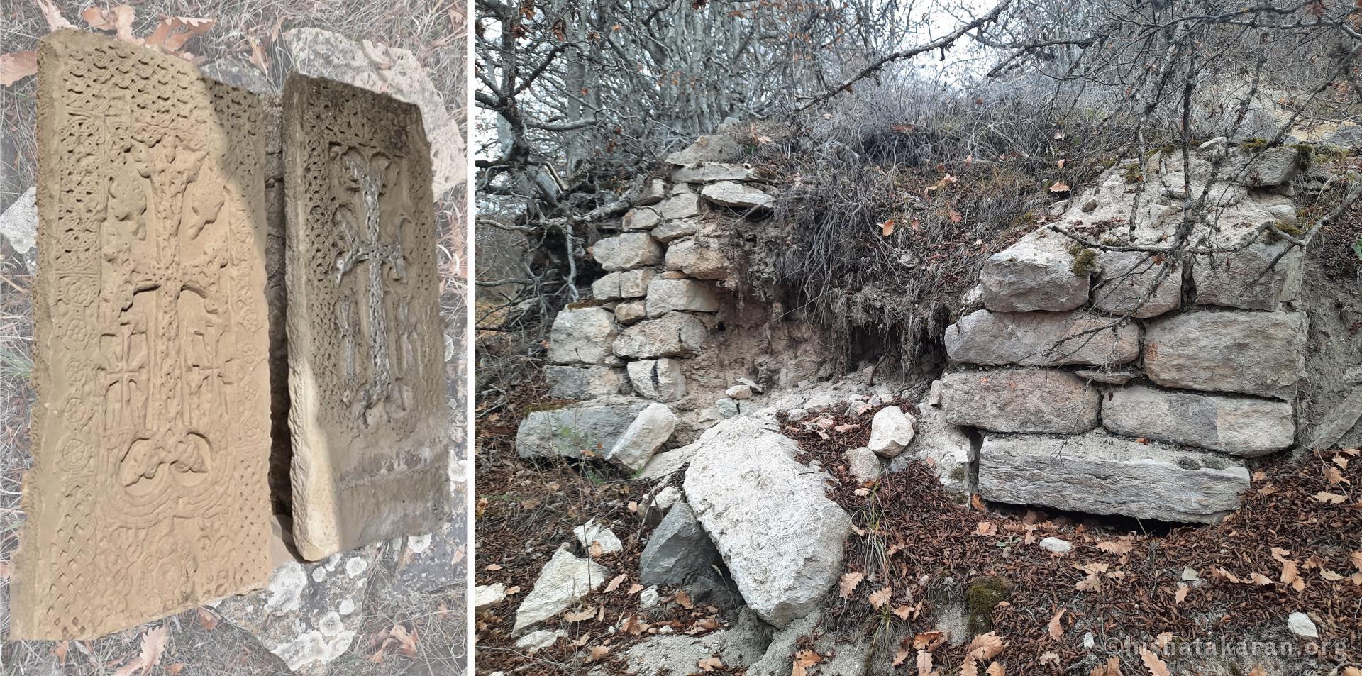 One of the three khachkars preserved from the monument is fragmented, while two are intact. Local residents relocated the khachkars to Karmir gyugh (Karmir village) for safekeeping. Eventually, they found their permanent home in the hall of the Surb Astvatsatsin (Saint Mother of God) Church in the village. Currently, remnants of the lower part of the building"s walls and fragments of the broken khachkar are preserved at the monument site.