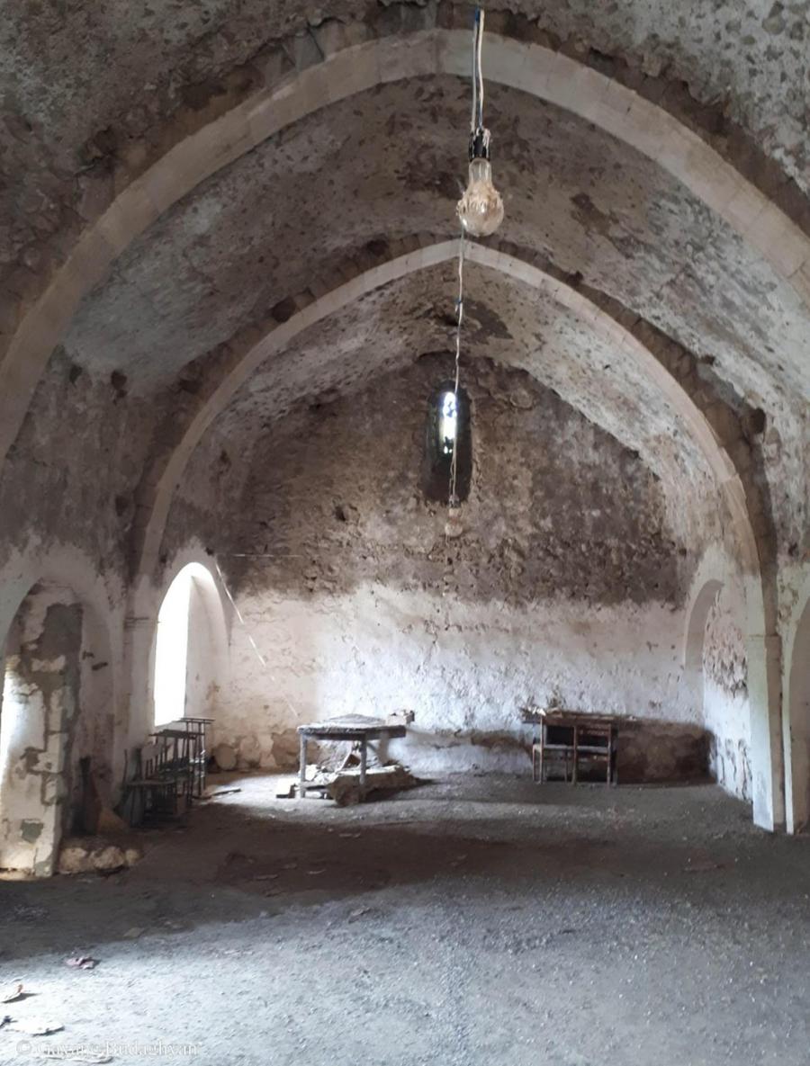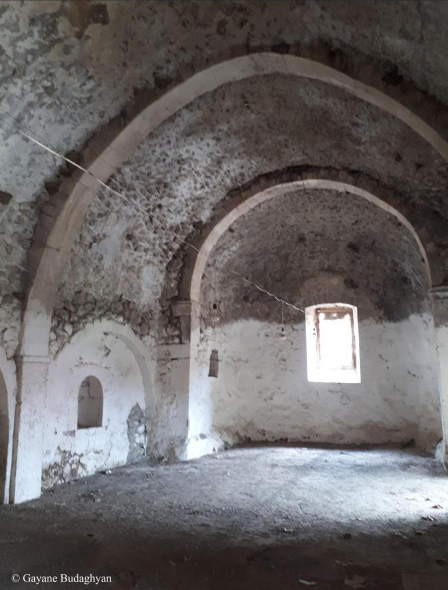 The church is a single-nave vaulted building with a rectangular plan and a semicircular apse. On the north and south walls of the apse are small niches with arched frames. Small-sized khachkars of dedicatory nature were used as jamb stones for these. The church lacks vestries. The altar platform is no longer preserved. On the eastern end of the northern wall, inside an arched niche, is the baptismal font.