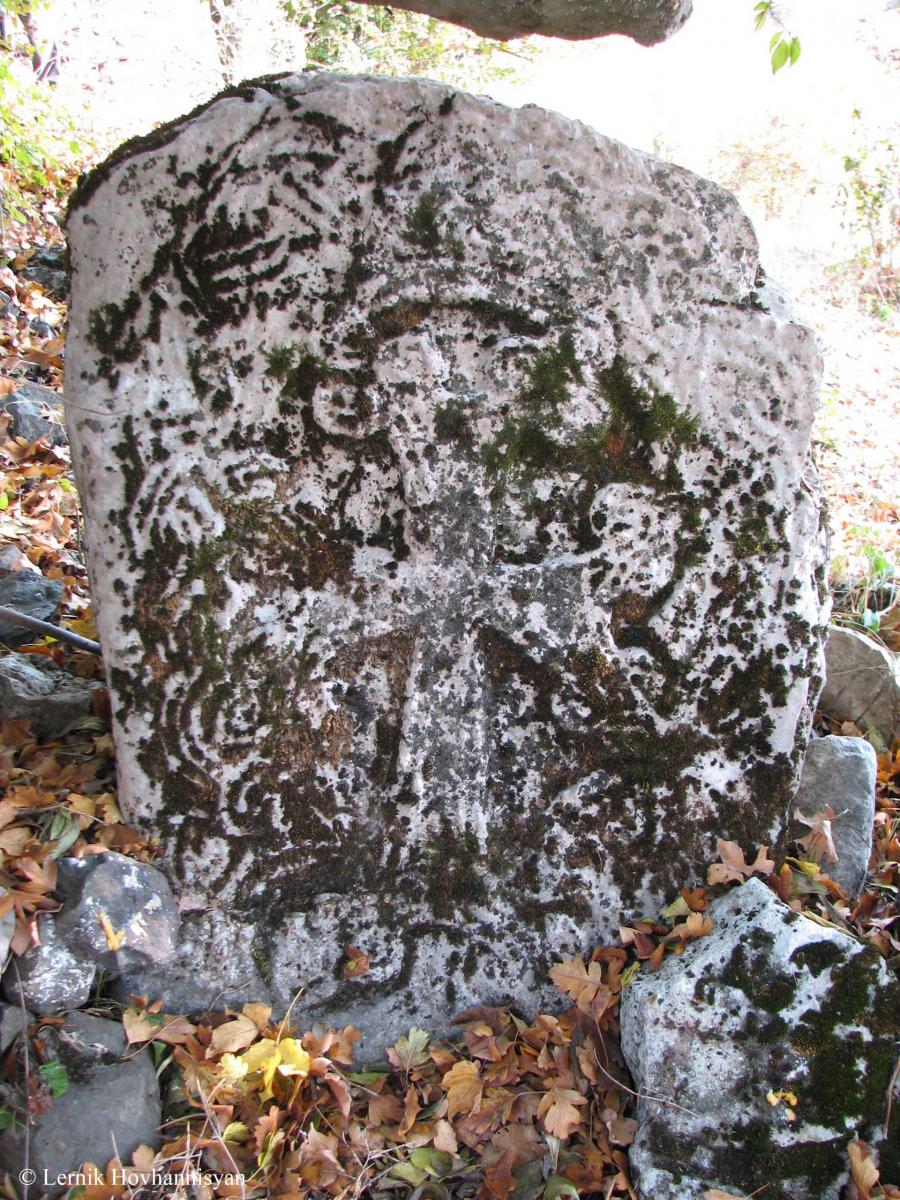 The khachkar is located approximately 30 meters south of the Karmir Avetaran Church, within a sacred site composed of five medieval khachkars. This small monument is carved from white-gray limestone. Its lower section is embedded in the ground, and the cross relief is weathered and covered with moss. The upper part of the monument is arched, with the right side partially damaged.At the center of the composition, beneath the cross-altar, is a large, blossoming cross with double trilobed ends on each arm. From the base of the cross relief, palm branches rise toward the horizontal arms. The cross is framed by a rope-like decorative border.