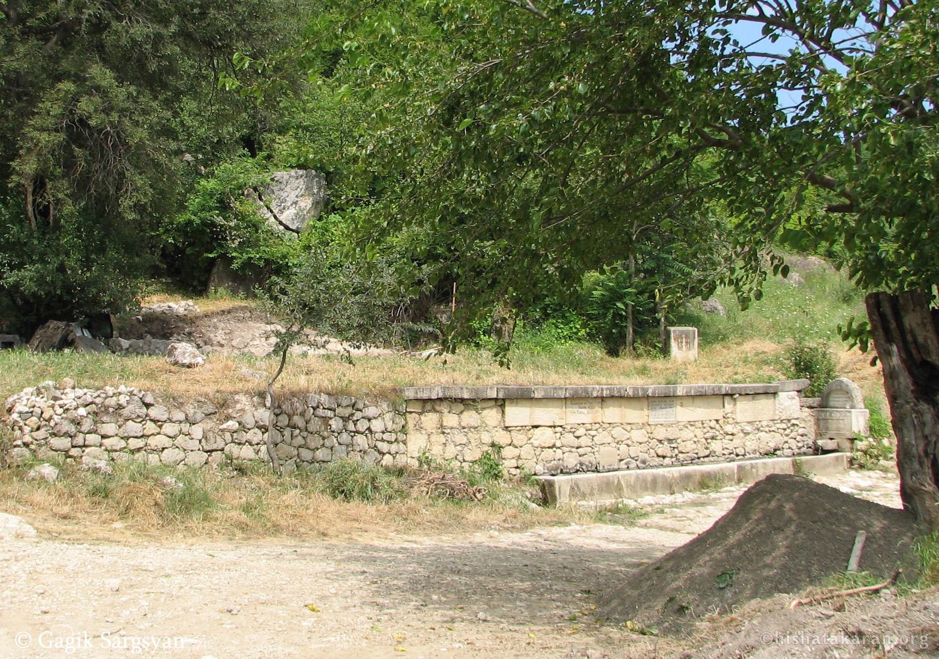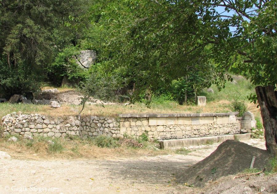 The Fountain of Saint Saribek is one of the five fountains of Kʻarashen (Dashushen) village and, in all likelihood, the most famous. It is located to the south of the shrine bearing the same name. The fountain was built with local roughly-hewn and finely-cut limestone. It consists of a longitudinal rear wall about seven meters long, and a single stone basin in front.On the lower part of the rear wall, on a finely-cut stone, there is a preserved inscription naming the builder and the date of construction: