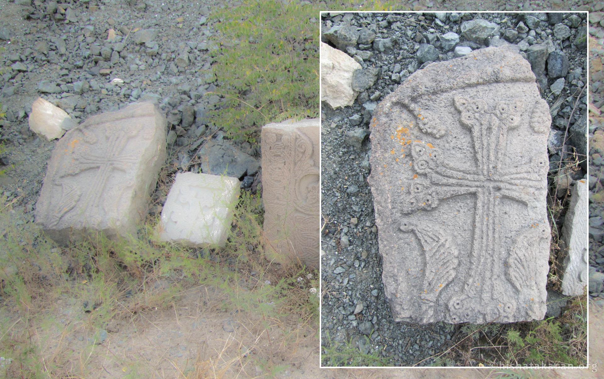 The current khachkar is located by the roadside in Nor Brajur village, leaning against several broken khachkars. The lower portion and edges of the khachkar, which had been repurposed as building material by the pastoral nomads, are damaged. The monument is small, with an arched top, and carved from gray limestone.