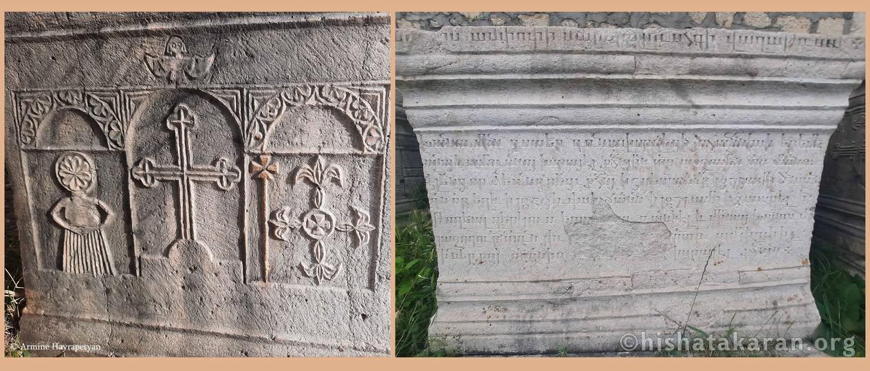Above the central arched niche of the tripartite composition, outside the circular frame, is a depiction of an angel—or a bird-like spirit figure—with wings outspread. According to the aforementioned inscription carved on the tombstone, the grave contains the remains of, prematurely departed, daughter of Yohannis Eremeants of Dṛnavarz, and her husband, Priest Tēr Poghosean Israēl (Israēl kʻahanay) of Tēr Manuēleantsʻ : «դռնավարզեցի Երեմեանց Յոhաննիսի դստեր և իր ամուսնու Տ[է]ր Մանու|էլե[ա]նց Տ[է]ր Պողոսե[ա]ն Իսրայէլ ք[ա]հ[ա]ն[ա]յի աճյունները»։