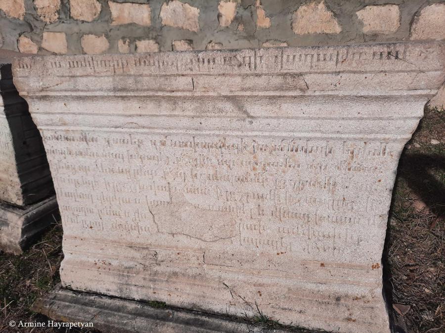 (Within this tomb are interred the remains of Khanum, of blessed memory, prematurely departed, daughter of Yohannis Eremeantsʻ of Dṛnavarz, and of her husband, Priest Israyēl (Israyēl kʻahanay), Tēr Poghos of the Tēr Manuēleantsʻ, who was ordained priest on September 5, 1870. He was born in 1850 and passed away on April 8, 1871, leaving two children, Daniēl and Mina Khanum. By the grace of God, ... Priest Israēl is likewise laid to rest beneath this tomb.)