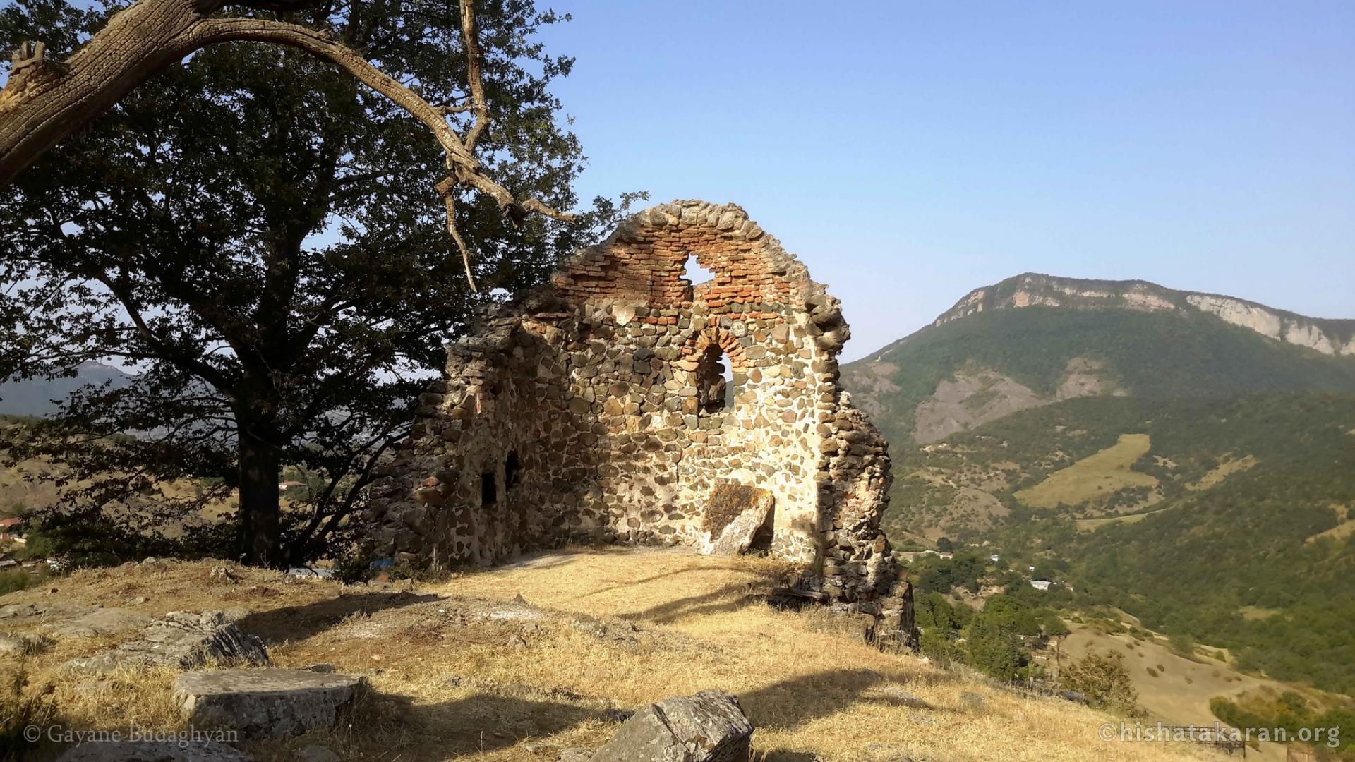The Karmir Yeghtsʻi (Red Church) is located in the southern part of Tumi village of Hadrut region, in an area known as Yeghtsʻu Khutʻ. Its precise original name is unknown. The name “ Karmir ” (Red) was given due to the red brick used in its construction. The ethnographer and folklorist Bishop Makar Barkhudaryan saw the church already in ruins at the end of the 19th century: «Գիւղիս հարաւային կողմում, ձորակի աջ կողմի սեռի վերայ, շինուած է հասարակ քարով: Ամբողջապէս փլած է եկեղեցուս հարաւային պատն և թաղն կամարներով միասին: Ունեցած է երկու դուռն հարաւային և արևմտեան կողմերից: Երկարութիւնն 11 մետր, լայնութիւնն 6 մետր 45 սանթիմ»1 (On the southern side of the village, on the right bank of the gorge, it is built with rough stone. The entire southern wall and its vault with arches have collapsed. It had two doors, on the south and west sides. Its length is 11 m, its width 6 m 45 cm.)