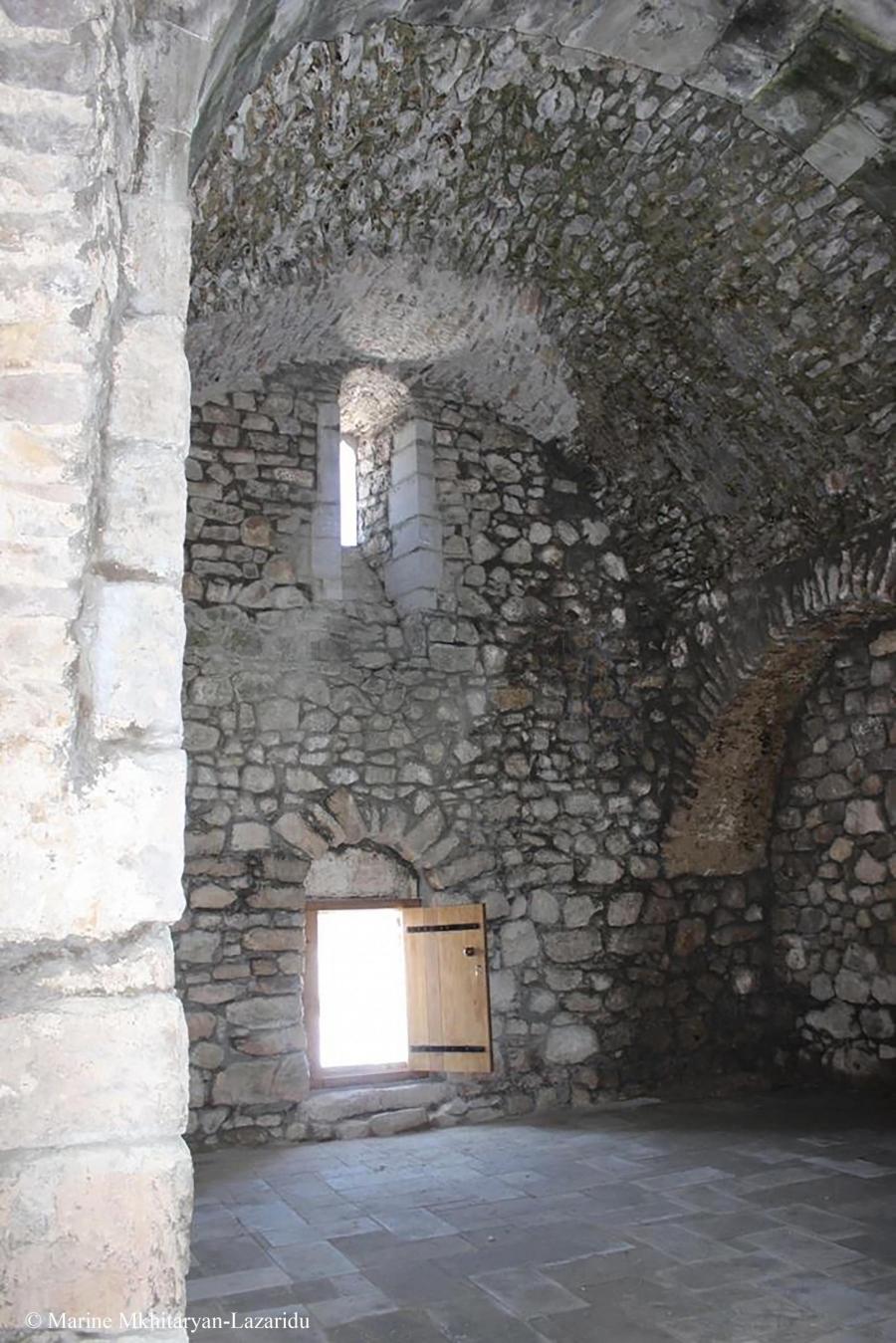 “The Pirumashen Church belongs to the group of basilicas and is classified among the single-nave type. More specifically, it falls under the subtype with a single pair of wall piers. Within this subtype, Pirumashen is distinguished as belonging to the group that has two vestries and massive, deeply embedded wall piers measuring 120–130 cm. Thanks to these, four deep (100 cm) wall arches were formed along the longitudinal walls, extending eastward and westward (two adjoining the southern wall and two adjoining the northern wall). The cylindrical vault of the church’s prayer hall, which rests on the arch connecting the wall piers, is seated at its base on the aforementioned wall arches. Structural features of this kind are also found in the Berkni Church5 and the Kʻarhan Monastery of Mirzik6.