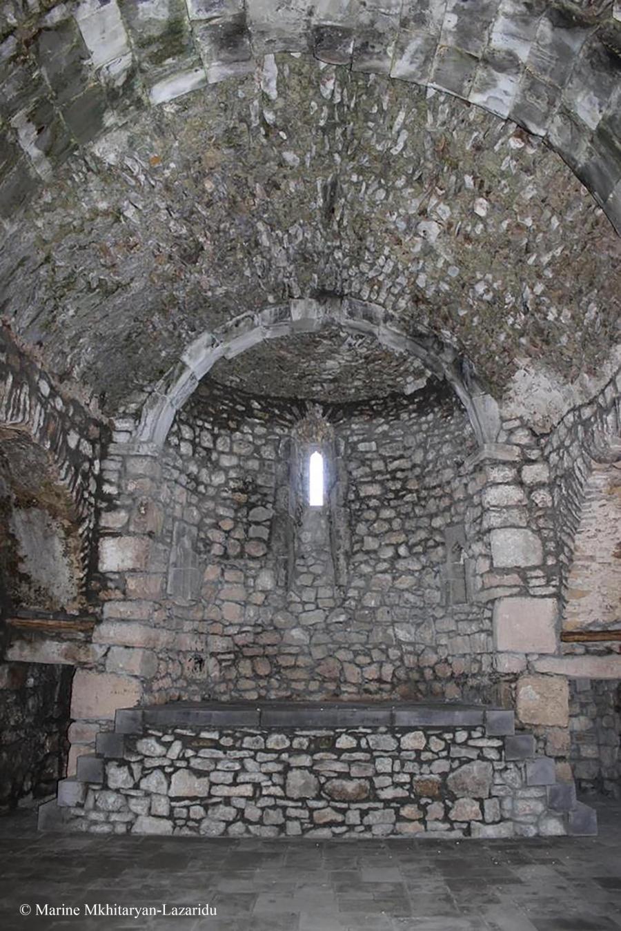 The sanctuary is semicircular, topped with a vaulted semi-dome. On the northern and southern walls there is one niche each, framed with dressed stone arches. In the southern niche, two inscribed khachkars are embedded, bearing the following inscriptions: «Խաչս | Էըային(՞)» and «Խաչս | Հումին»8.